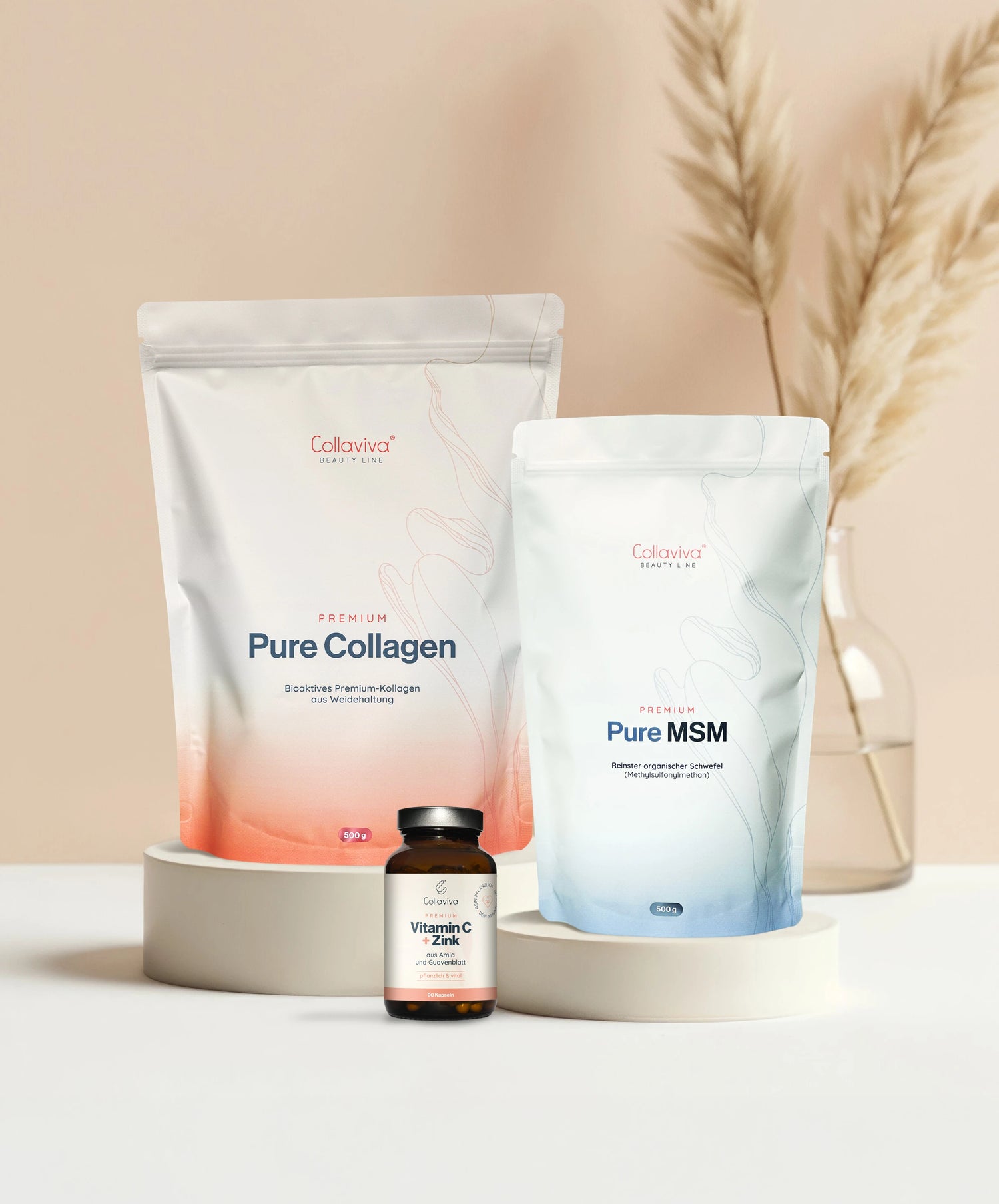 Deine tägliche Kollagen-Routine in einem Bundle: PureCollagen, MSM und unser pflanzliches Vitamin C + Zink ergänzen sich ideal – für alle, die Haut, Bindegewebe und Alltag aktiv unterstützen möchten.