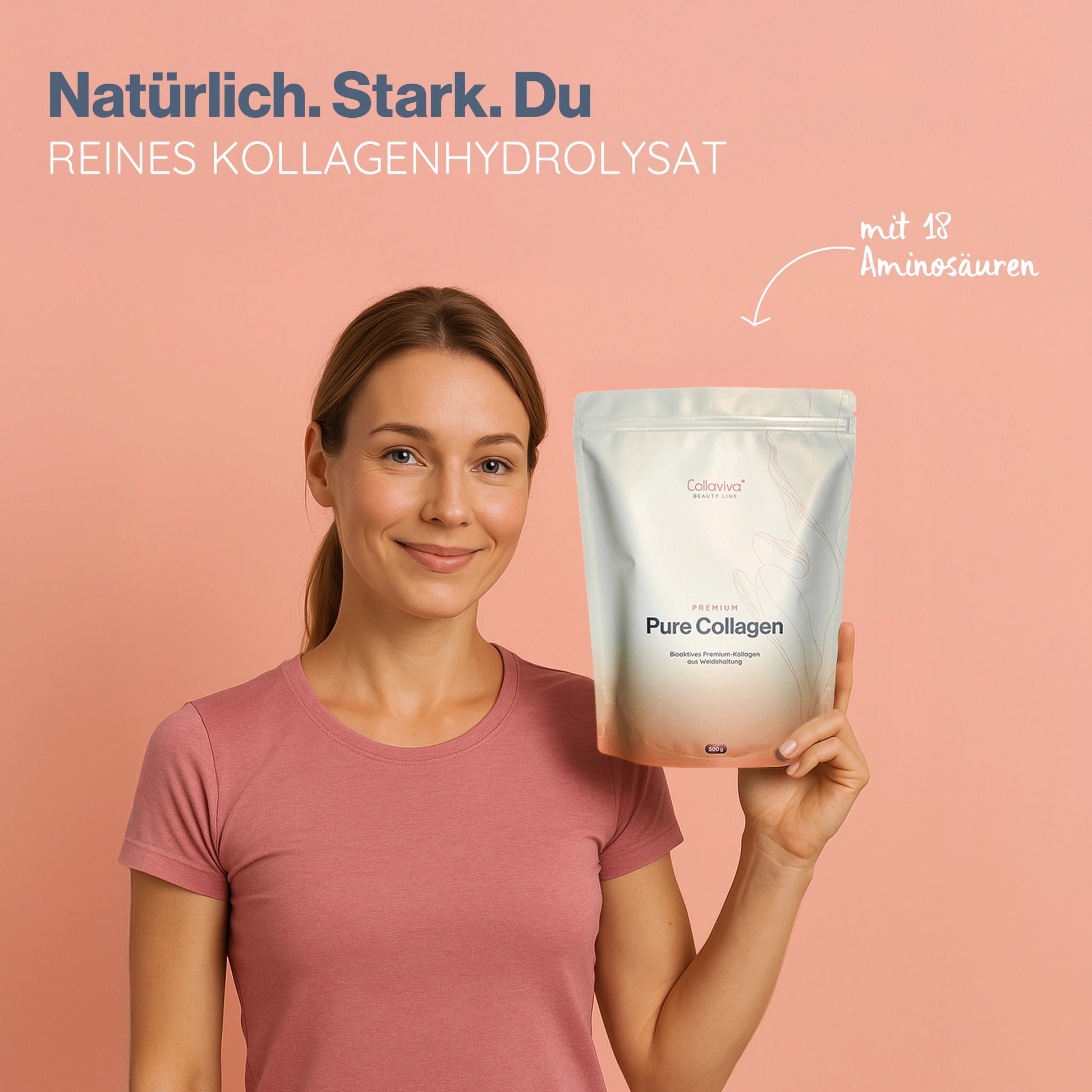 Kollagen ist ein Strukturprotein, das essenziell für die Straffheit und Elastizität der Haut ist. Mit zunehmendem Alter nimmt die körpereigene Kollagenproduktion ab – deshalb ergänzen viele Menschen ihre Ernährung mit unserem Kollagen. Unser Kollagen kann Anzeichen der Hautalterung reduzieren⁴. (s. oben "Wirkung")