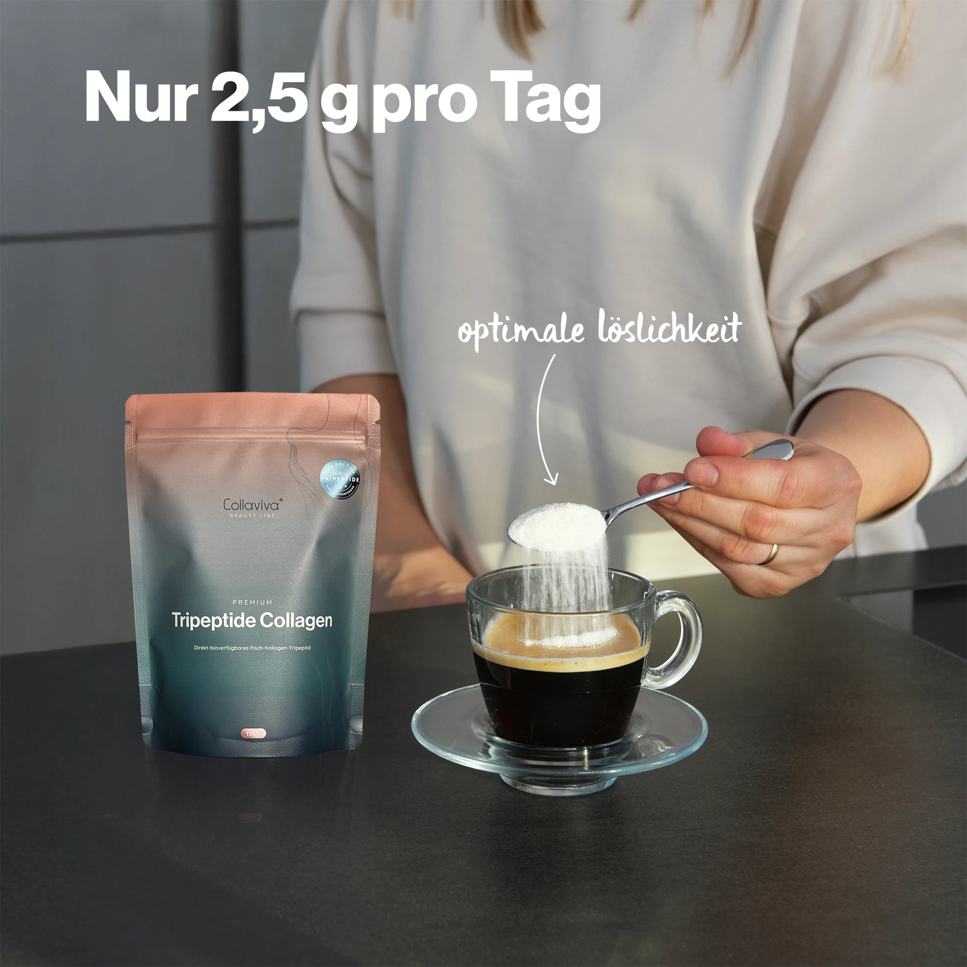 Bereits 2,5 g Tripeptide Collagen täglich liefern die gleiche Wirkung wie 10 g Rinderkollagen – bei deutlich geringerer Dosierung.